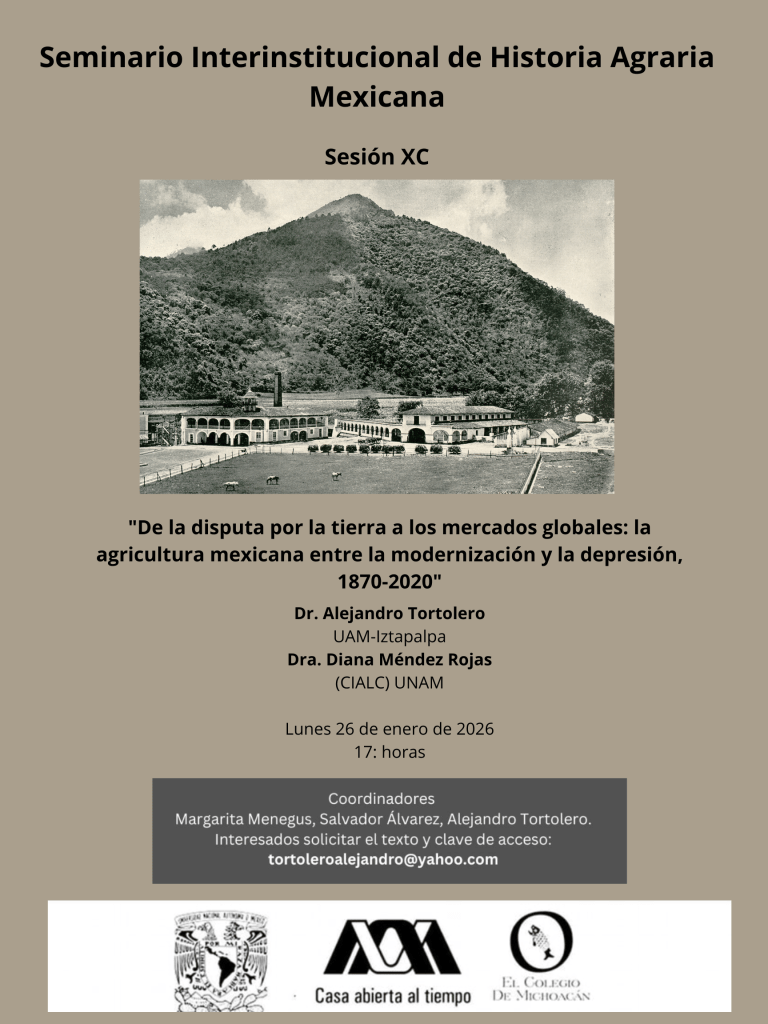 El Seminario Interinstitucional de Historia Agraria Mexicana (UAM-UNAM-COLMICH) invita al público interesado en participar en la siguiente sesión, en la que el Dr. Alejandro Tortolero y Dra. Diana Méndez Rojas, presentaran el texto «De la disputa por la tierra a los mercados globales: la agricultura mexicana entre la modernización y la depresión, 1870-2020»