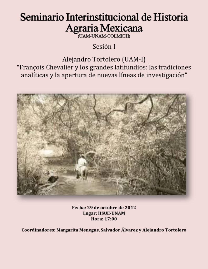 Ponencia: «Francois Chevalier y los grandes latifundios: las tradiciones analíticas y la apertura de nuevas líneas de investigación», Alejandro Tortolero Villaseñor (UAM-I)