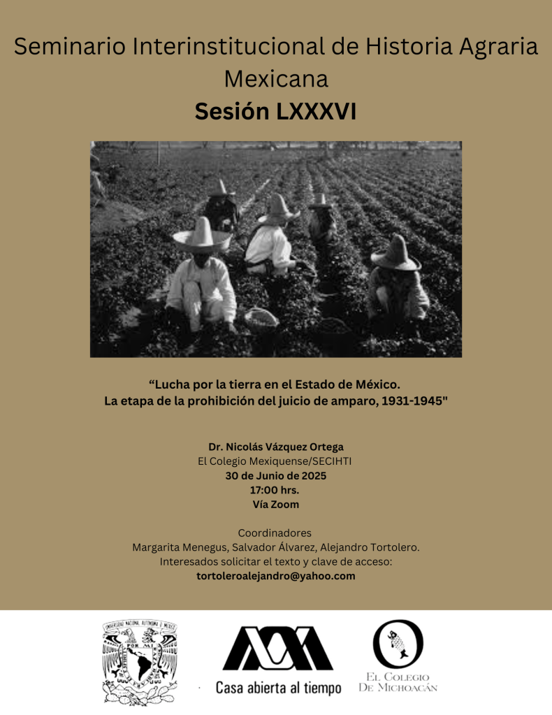 El seminario Interinstitucional de Historia Agraria Mexicana (UAM-UNAM-COLMICH) invita al público interesado en participar en la siguiente sesión, donde el 𝐃𝐫. 𝐍𝐢𝐜𝐨𝐥𝐚́𝐬 𝐕𝐚́𝐳𝐪𝐮𝐞𝐳 𝐎𝐫𝐭𝐞𝐠𝐚 (El Colegio Mexiquense, A. C. /Secretaría de Ciencia ) presentará el texto «𝐋𝐮𝐜𝐡𝐚 𝐩𝐨𝐫 𝐥𝐚 𝐭𝐢𝐞𝐫𝐫𝐚 𝐞𝐧 𝐞𝐥 𝐄𝐬𝐭𝐚𝐝𝐨 𝐝𝐞 𝐌𝐞́𝐱𝐢𝐜𝐨. 𝐋𝐚 𝐞𝐭𝐚𝐩𝐚 𝐝𝐞 𝐥𝐚 𝐩𝐫𝐨𝐡𝐢𝐛𝐢𝐜𝐢𝐨́𝐧 𝐝𝐞𝐥 𝐣𝐮𝐢𝐜𝐢𝐨 𝐝𝐞 𝐚𝐦𝐩𝐚𝐫𝐨, 𝟏𝟗𝟑𝟏-𝟏𝟗𝟒𝟓».