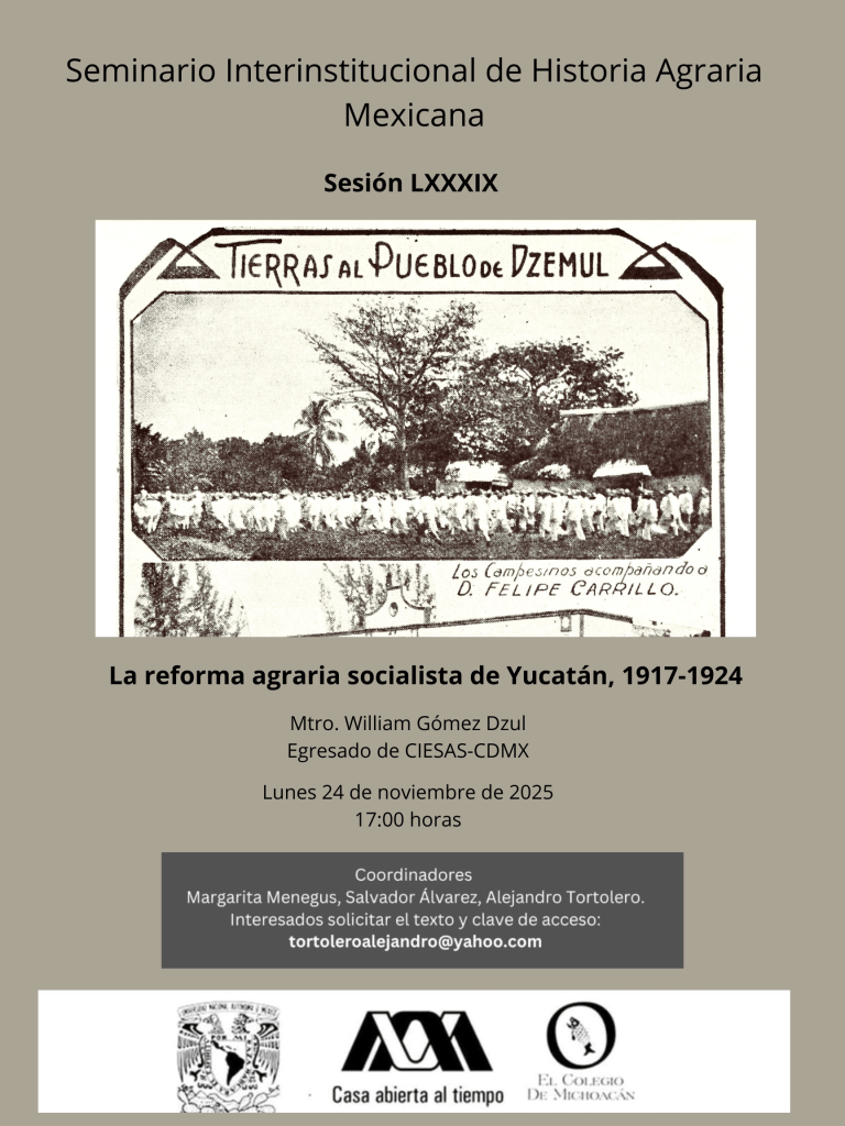 El Seminario Interinstitucional de Historia Agraria Mexicana (UAM-UNAM-COLMICH) invita al público interesado en participar en la siguiente sesión, donde Mtro. William Gómez Dzul (egresado de Centro Investigaciones y Estudios Superiores en Antropología Social-Ciudad de México) presentará el texto “La reforma agraria socialista de Yucatán, 1917-1924”.